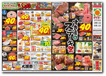 1階 開店9:30~閉店23:00 衣料 開店9:30~閉店20:00 ※広告商品は朝9時30分からの販売とさせて頂きます。当店取り扱いの広告商品は上記チラシにてご確認をお願い致します。 |