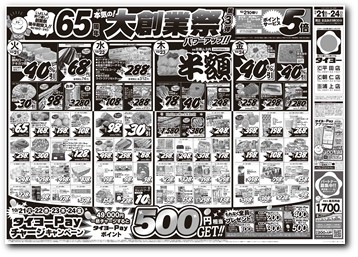 開店9:30~閉店23:00 ※広告商品は朝9時30分からの販売とさせて頂きます。当店取り扱いの広告商品は上記チラシにてご確認をお願い致します。 |